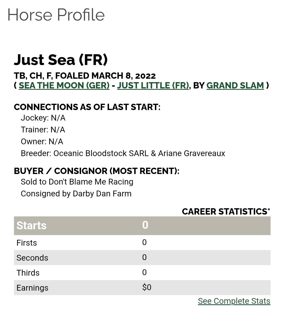 And then, Wednesday morning, one more call. Another racing and broodmare prospect—this time a French filly named Just Sea, by Sea The Moon (GER) out of Just Little by Grandslam. Unraced, full of potential, and according to Di, she stepped right onto the trailer without a second thought.